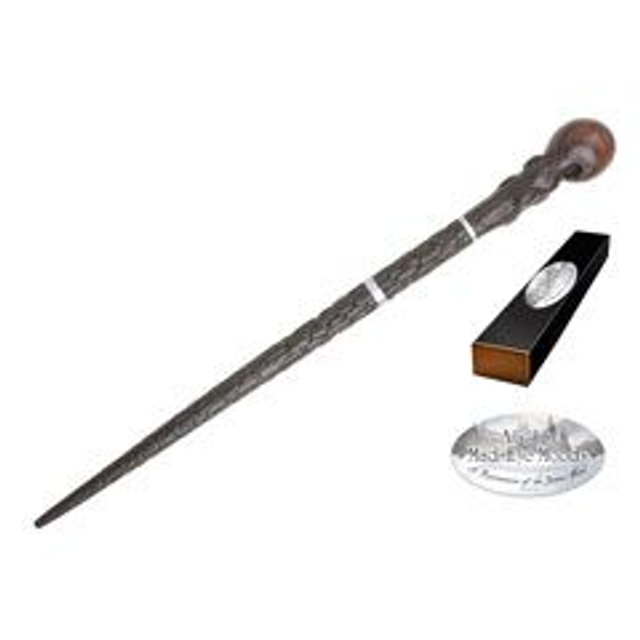 Cette baguette en résine est fournie dans la boîte de la collection ''personnages'' et est accompagnée d'une plaque nominative. La baguette imite un bois sombre à l’aspect d’écorce, dont le manche forme une boule d’une couleur de bois plus clair.