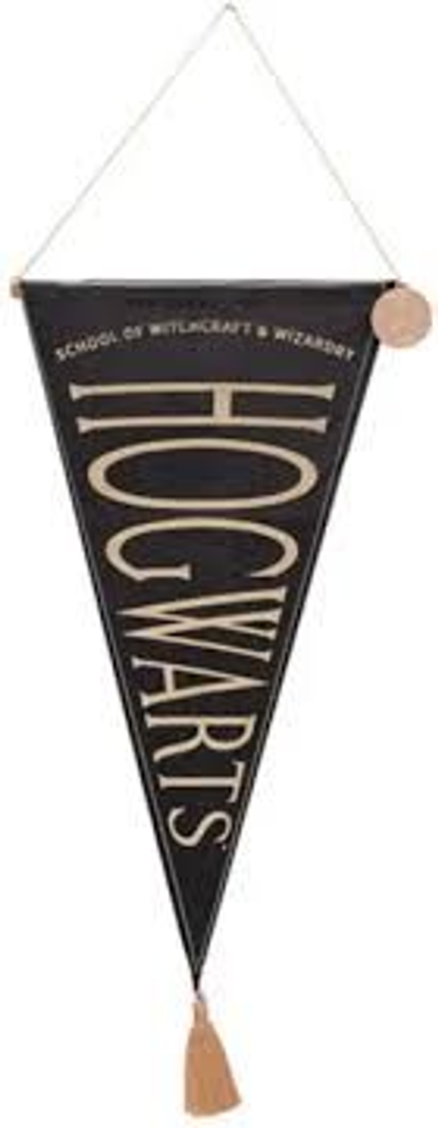 La bannière triangulaire en tissu noir présente une bordure dorée, avec le titre « Poudlard » imprimé en or, un pompon doré et un ornement « timbre de Poudlard ». Il est conçu pour être exposé au mur à l'aide du support en fil doré ci-joint.