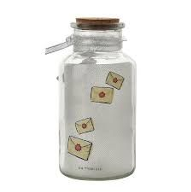 Le bocal en verre présente un aspect givré, avec une grande image imprimée d'Hedwige. Il est fermé par une bonde en liège et orné d'un ruban argenté autour du cou auquel est attachée une lettre de Poudlard.